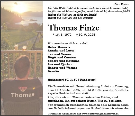 Wer noch nie Abschied nehmen musste, kennt die Last der Sehnsucht nicht. Thomas bleibt fest in Euren Herzen. Wir wünschen Euch Kraft, Zeit und Raum um Euren Verlust verarbeiten zu können.
